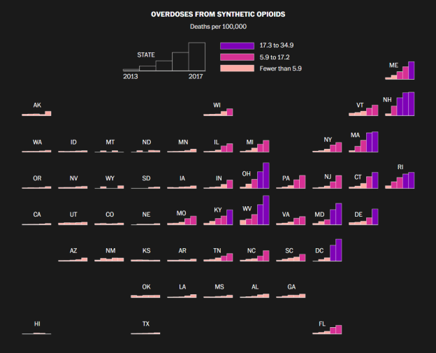 «Between 2013 and 2017, more than 67,000 people died of synthetic-opioid-related overdoses — exceeding the number of U.S. military personnel killed during the Vietnam, Iraq and Afghanistan wars combined. The number of deaths, the vast majority from fentanyl, has risen sharply each year.