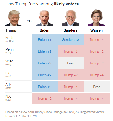 «The Times/Siena results and other data suggest that the president’s advantage in the Electoral College relative to the nation as a whole remains intact or has even grown since 2016, raising the possibility that the Republicans could — for the third time in the past six elections — win the presidency while losing the popular vote.»