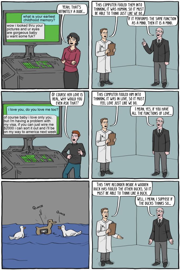 Turing Tests and Other Things of That Nature – Existential Comics Leave a reply http://existentialcomics.com/comic/357 On artificial intelligence. Share this: Share on X (Opens in new window) X Share on Facebook (Opens in new window) Facebook Email a link to a friend (Opens in new window) Email Share on Mastodon (Opens in new window) Mastodon Like Loading... Related