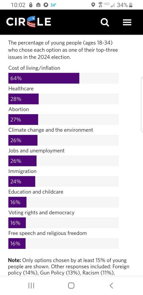 «Young people who chose issues like racism, abortion, and climate change as their top priority in the 2024 election were the most likely to support Harris. However, 40% of youth chose “the economy and jobs” as their top priority—by far the highest of any issue, and those youth voted for Trump by a more than 22-point margin. Immigration was the third most commonly chosen top issue among youth overall, and the young people who chose it voted for President Trump by a nearly 70-point margin.»